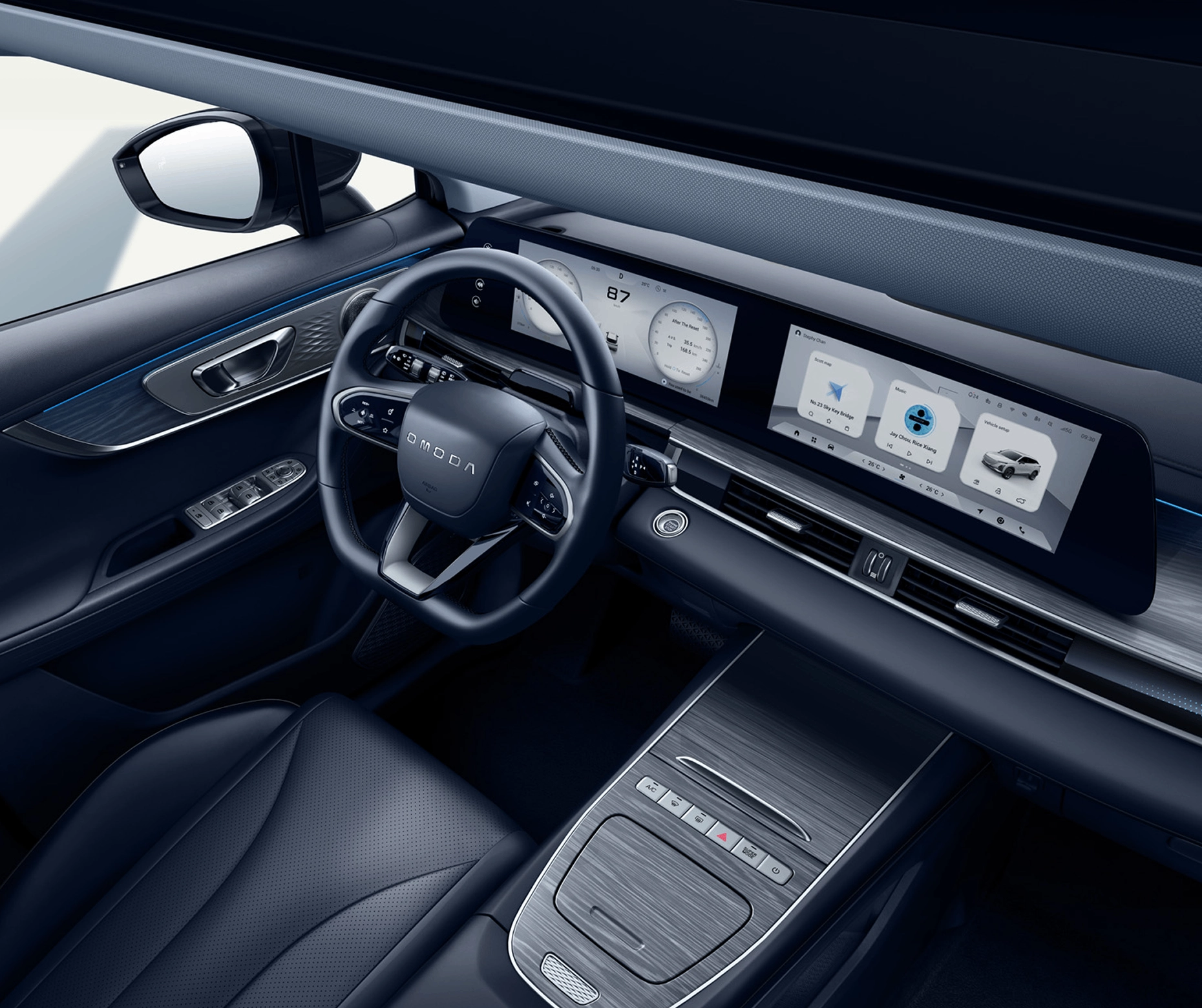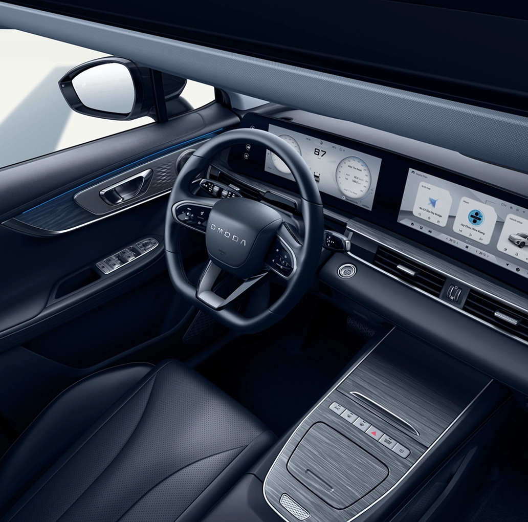 De OMODA 5 SHS-H is uitgerust met een digitaal instrumentenpaneel en een geavanceerd multimediasysteem. Twee 12,3-inch LCD-displays bieden HD-resolutie; het tweede display is aanraakgevoelig en ondersteunt draadloos Android Auto en Apple CarPlay.